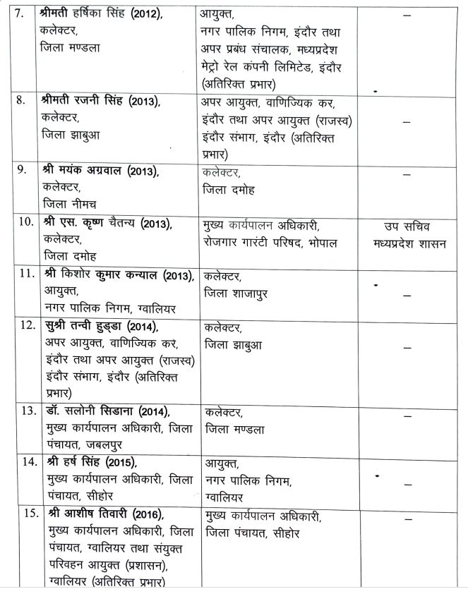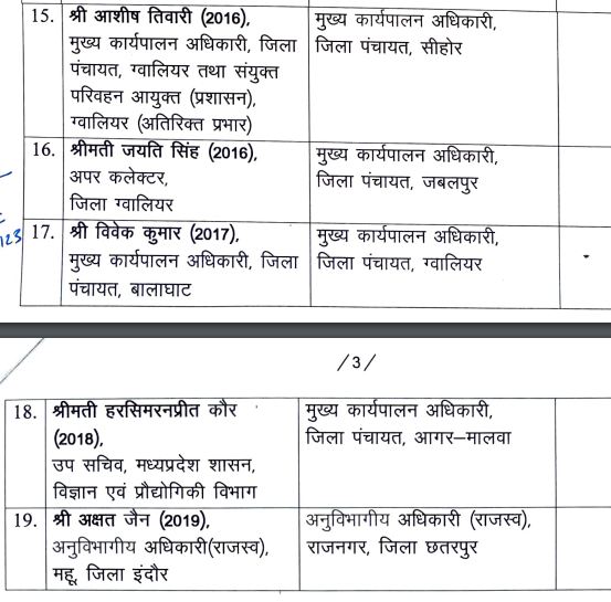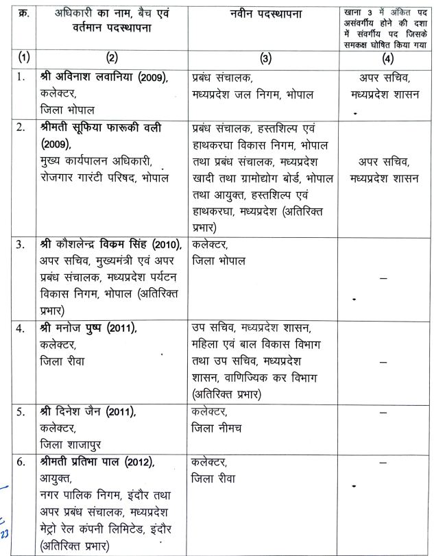 पलपल संवाददाता, जबलपुर/भोपाल. एमपी में आईपीएस अधिकारियों के स्थानान्तरण के बाद अब आईएएस अधिकारियों के ट्रांसफर भी शुरु हो गए है. आज प्रदेश के कुछ जिलों के कलेक्टर, सीईओ के स्थानान्तरण आदेश जारी हुए है. जिसमें जबलपुर जिला पंचायत सीईओ का सलोनी सिडाना को मंडला कलेक्टर बनाकर भेजा गया है. इसके अलावा 18 आईएएस अधिकारियों को इधर से उधर किया गया है.
