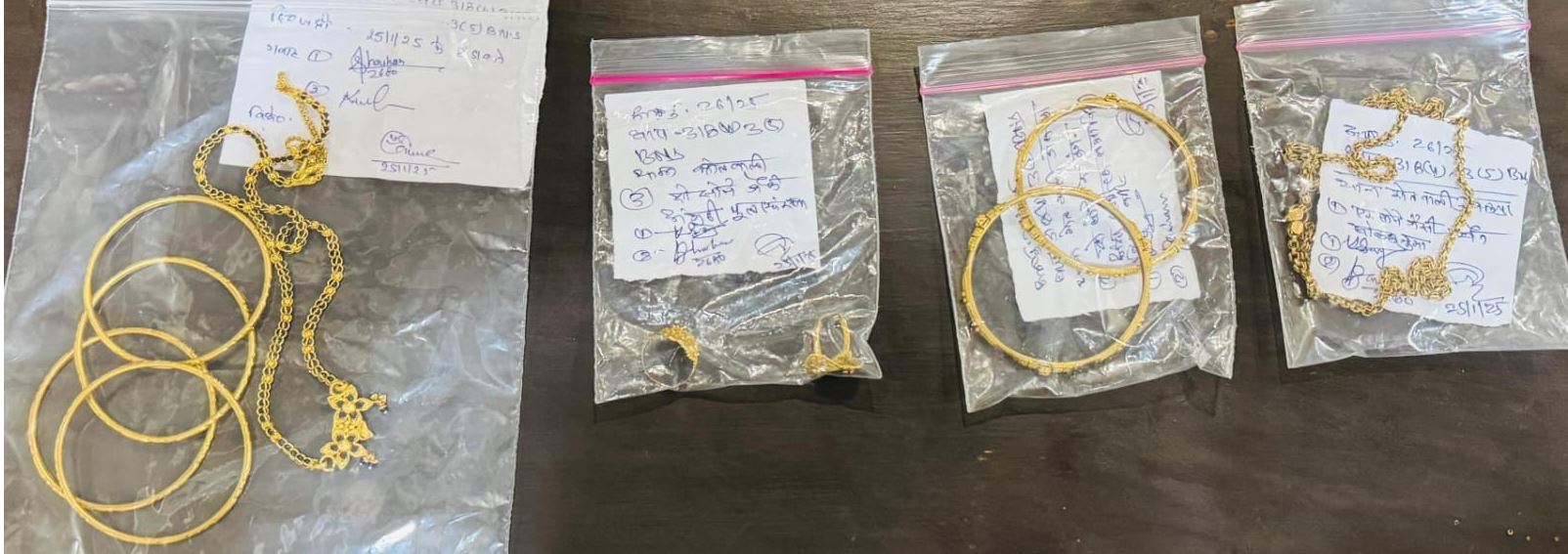 जिसपर पुलिस नांदूरा पहुंच गई. पुलिस ने अमजद के ठिकाने पर दबिश दी. अमजद के पिता मनहर अली ईरानी मिले. फोटो दिखाने पर उन्होने अपना बेटा होना बताया. इसके बाद पुलिस ने डेरे के आसपास तलाशी ली तो एक नीम के पेड़ के नीचे पालीथिन में रखी सोने की 4 चूड़ी, 2 कंगन, 1 मंगलसूत्र, 1 चेेन, 2 अंगूठी रखी हुई. उक्त जेवर जबलपुर में थाना कोतवाली एवं कैंट में 2 महिलाओ से पुलिस वाला बनकर जेवर उतरवाकर ठगे थे. पुलिस ने विधिवत कार्यवाही कर तौल करने पर साढ़े चौदह तोले सोने के जेवरात कीमती साढ़े ग्यारह लाख रुपए के जेवर बरामद कर आरोपियों की तलाश शुरु कर दी है. इन्हे पकडऩे के लिए संभावित ठिकानों पर दबिश दी जा रही है.