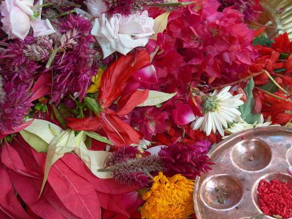 लक्ष्मी को लाल और पीले, दुर्गा को लाल और सरस्वती को सफेद रंग के फूल अर्पित करने की परंपरा है. लक्ष्मी सौभाग्य की प्रतीक है अत: लाल रंग प्रिय है. विष्णु की पत्नी होने से वे पीले रंग के फूल से भी प्रसन्न होती हैं. दुर्गा शक्ति की प्रतीक है. लाल रंग शौर्य का रंग है. अत: वे लाल रंग के फूल से प्रसन्न होती हैं. सरस्वती ज्ञान और संगीत की देवी है. शुभ्रता की प्रतीक. उन्हें सफेद रंग के कमल पुष्प अर्पित किए जाते हैं.