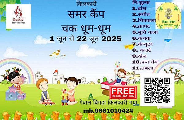 हर दिन अलग-अलग विद्या के बच्चों को लिखित परीक्षा दी गई इसमें पूरे बिहार के बाल भवन से आए बच्चे शामिल हुए . प्रमंडल कार्यक्रम समन्वयक राजीव रंजन श्रीवास्तव ने बताया कि बच्चों की गुणवत्ता बढ़ाने के लिए इस बार समर कैंप चक धूम-धूम का आयोजन बिहार बाल भवन किलकारी गया में बच्चों के लिए निशुल्क किया जा रहा है जिसमें बच्चे नृत्य ,संगीत, कंप्यूटर, चित्रकला, स्कल्पचर,मूर्ति कला, कराटे,खेल, और भी बहुत कुछ सिखाया जाएगा स्थानीय कलाकार तो रहेंगे लेकिन बाहर से इन सभी विधाओं के एक्सपर्ट भी बच्चों को प्रशिक्षण देने के लिए आ रहे हैं जो 1 जून से 20 जून तक लगातार चलता रहेगा बच्चों के मनोरंजन के लिए तरह-तरह के गेम का भी आयोजन किया जा रहा है जैसे तरबूज रेस रचना गुपचुप रेस आदि का भी प्रतियोगिता होगा बच्चे अभी से ही जुड़ना चालू हो गए हैं सीधे किलकारी से बच्चे आकर जुड़ सकते हैं या ऑनलाइन क्यूआर कोड के माध्यम से भी बच्चे अपना रजिस्ट्रेशन करवा रहे हैं .