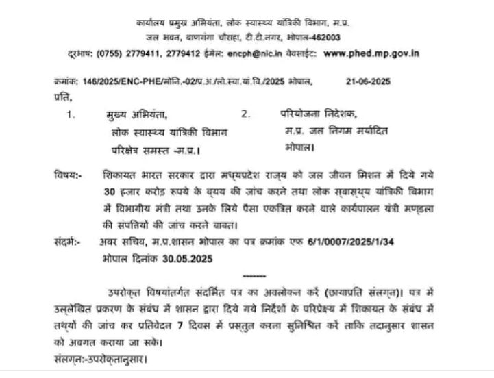 प्रमुख अभियंता कार्यालय ने सभी मुख्य अभियंता पीएचई व परियोजना निदेशक मप्र जल निगम को इस मामले में चि_ी लिखकर सात दिन में रिपोर्ट देने को कहा. निर्देश में कहा गया कि भारत सरकार ने राज्य के जल जीवन मिशन को दिए 30 हजार करोड़ के खर्च की जांच की जाए. साथ ही पीएचई मंत्री संपतिया उईके व उनके लिए पैसा जमा करने वाले मंडला के कार्यपालन यंत्री की संपत्तियों की जांच के निर्देश दिए गए थे.