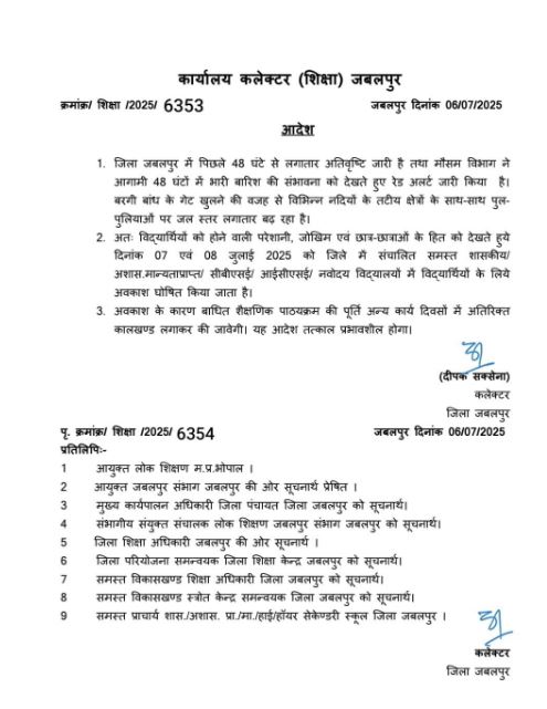 पलपल संवाददाता, जबलपुर. जिले में हो रही लगातार बारिश को देखते हुए कलेक्टर दीपक सक्सेना ने दो दिन स्कूलों की छुट्टी दे दी है. ये स्कूल 7 और 8 जुलाई को बंद रहेंगे. लगातार हो रही बारिश तथा मौसम विभाग द्वारा आगामी 48 घण्टे के दौरान भारी वर्षा की बताई.