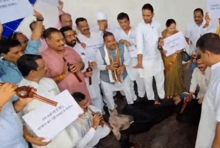 सदन की कार्यवाही शुरू होने से पहले कांग्रेस विधायकों ने बीन बजाकर प्रदर्शन किया. एक विधायक भैंस बने. नेता प्रतिपक्ष ने कहा कि हम सरकार को जगा रहे हैं. कांग्रेस विधायक कैलाश कुशवाहा से सुरक्षाकर्मियों ने ब्लैक गाउन उतारने का अनुरोध किया. कुशवाहा भैंस का रूप धरकर आए थे. उन्होंने गाउन उतारा फिर अंदर गए.