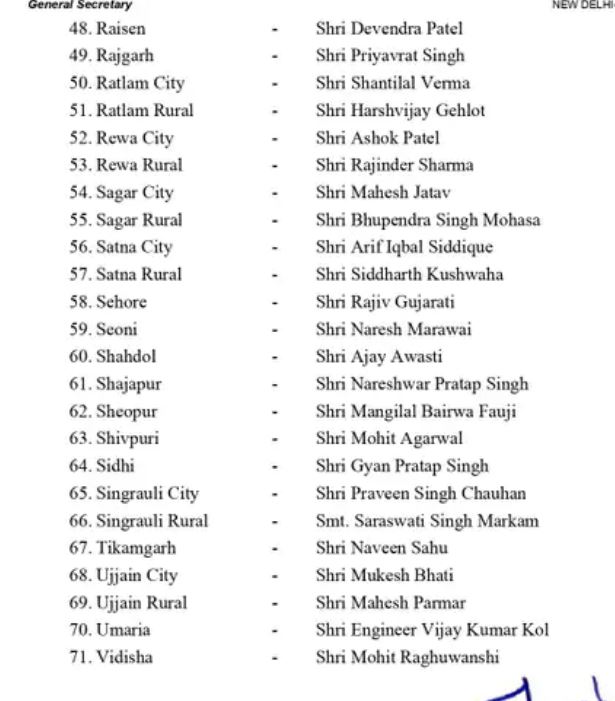 गुना में पूर्व सीएम के बेटे व राघौगढ़ से विधायक जयवर्धन सिंह को जिला अध्यक्ष बनाया गया है. उज्जैन शहर मुकेश भाटी और उज्जैन ग्रामीण में महेश परमार को जिम्मेदारी दी गई है. कांग्रेस के 71 जिला अध्यक्षों की लिस्ट में महज 4 महिलाओं को जिम्मेदारी सौंपी गई. 6 वर्तमान विधायकों को भी जिला संगठन की कमान दी गई है. 8 पूर्व विधायकों को भी जिला अध्यक्ष बनाया गया है.