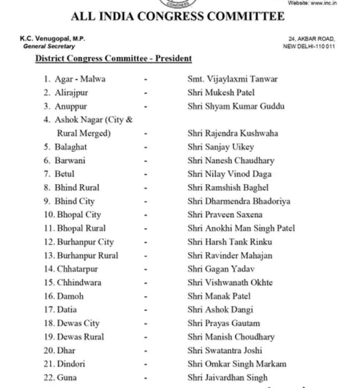 पलपल संवाददाता, जबलपुर/भोपाल. मध्यप्रदेश में कांग्रेस ने 71 जिलों के अध्यक्षों की घोषणा कर दी है. इसमें चिंटू चौकसे को इंदौर शहर, विपिन वानखेड़े को इंदौर ग्रामीण की कमान दी गई है. भोपाल शहर कांग्रेस के जिला अध्यक्ष प्रवीण सक्सेना,ग्रामीण जिला अध्यक्ष अनोखी मानसिंह पटेल को रिपीट किया गया है. इसी तरह जबलपुर में सौरभ शर्मा नाटी को शहर व संजय यादव को ग्रामीण अध्यक्ष की जिम्मेदारी सौंपी गई है.