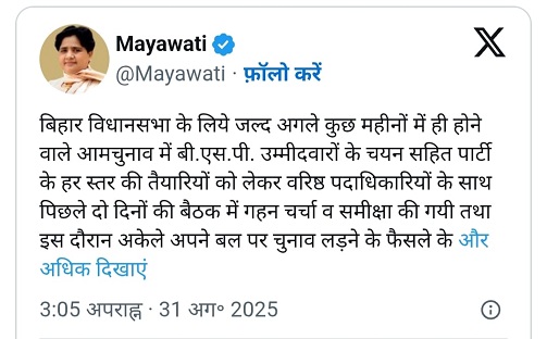 इस बाबत रविवार को सोशल मीडिया प्लेटफॉर्म एक्स पर मायावती ने इसकी जानकारी दी. उन्होंने लिखा, बिहार चुनाव को लेकर पिछले दो दिन तक चली समीक्षा बैठक में उम्मीदवारों के चयन सहित पार्टी के हर स्तर की तैयारियों को लेकर वरिष्ठ पदाधिकारियों के साथ बैठक करने के बाद आने वाले दिनों में पार्टी के विभिन्न कार्यक्रमों की रूपरेखा को अंतिम रूप दिया जाएगा.सोशल मीडिया प्लेटफॉर्म एक्स के मुताबिक बहुजन समाज पार्टी ने बिहार विधानसभआ चुनाव अकेले लड़ने का ऐलान किया है. बहुजन समाज पार्टी प्रमुख मायावती ने रविवार को कहा कि उनकी पार्टी आगामी बिहार विधानसभा चुनाव अकेले लड़ेगी और दो दिनों की उच्चस्तरीय समीक्षा बैठकों के बाद अपने संगठनात्मक कार्यक्रमों की रूपरेखा तैयार कर ली है.
