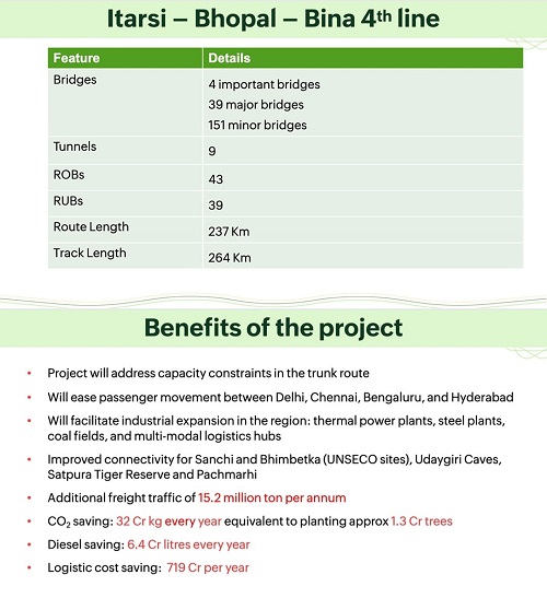 कैबिनेट ने चार रेलवे परियोजनाओं को मंजूरी दी है, जिनकी कुल लागत लभगभ 24,634 करोड़ रुपये है. मंत्रिमंडल ने जिन परियोजनाओं को हरी झंडी दी है, उनमें महाराष्ट्र के वर्धा से भुसावल के बीच 314 किलोमीटर की दूरी को कवर करने वाली तीसरी और चौथी लाइन हैं. महाराष्ट्र के गोंदिया और छत्तीसगढ़ में डोंगरगढ़ के बीच 84 किमी लंबी चौथी लाइन, गुजरात के वडोदरा और मध्य प्रदेश में रतलाम के बीच 259 किमी लंबी तीसरी और चौथी लाइन और मध्य प्रदेश में इटारसी-भोपाल-बीना के बीच 84 किलोमीटर लंबी चौथी लाइन शामिल हैं.