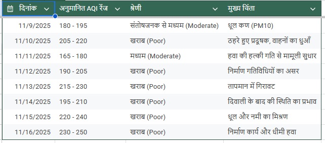 जबलपुर में वायु गुणवत्ता सूचकांक (AQI) की स्थिति पिछले एक सप्ताह यानी 9 नवंबर से 16 नवंबर 2025 के बीच संतोषजनक श्रेणी से ऊपर उठकर लगातार 'खराब' श्रेणी के इर्द-गिर्द घूमती रही है, जिसने शहर में स्वास्थ्य चिंताएं बढ़ा दी हैं। इस पूरे सप्ताह, शहर औसतन मध्यम से खराब वायु गुणवत्ता में फँसा रहा है, जो यह दर्शाता है कि सांस और हृदय रोगों से ग्रस्त लोगों के लिए लगातार जोखिम बना हुआ है।