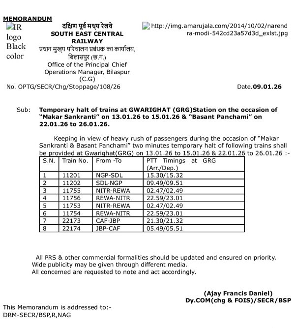 दक्षिण-पूर्व-मध्य रेलवे बिलासपुर जोन ने इस संबंध में एक आदेश जारी कर दिया है। साथ ही जिन गाडिय़ों का हाल्ट दिया गया है, उसकी तारीख, समय व विस्तृत समय सारिणी भी जारी की है. जारी आदेश में 13 जनवरी से 15 जनवरी तक फिर बसंत पंचमी के अवसर पर 22 जनवरी से 26 जनवरी तक हाल्ट रहेगा.