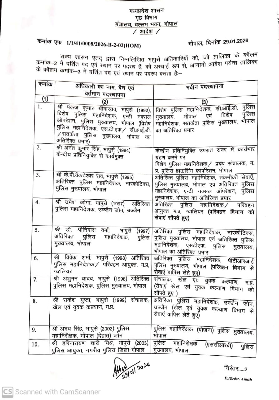 उज्जैन रेंज के एडीजी उमेश जोगा की सेवाएं परिवहन विभाग को सौंपते हुए आयुक्त बनाया गया है. केन्द्रीय प्रतिनियुक्ति से लौटे अधिकारियों को भी नई जिम्मेदारी दे दी गई है. जिनमें अनंत कुमार सिंह को पुलिस हाउसिंग कार्पोरेशन का अतिरिक्त पुलिस महानिदेशक नियुक्त किया गया है.